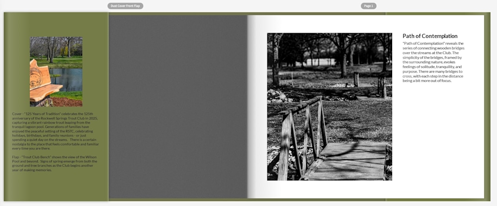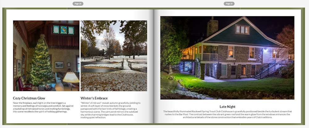 This first edition of the Rockwell Springs Coffee Table Book truly captures the environment that RSTC club members, family, and guests have come to love for over 125 years.  This is a deluxe, hard bound book with thirty high resolution images that feature the year-round fishing experience at Rockwell.  This edition features a durable, full color dust jacket that envelopes pictures from all areas across the grounds.  The pictures capture the beauty of the trees and plantings, the beloved buildings, as well as the serene waters and active wildlife that have helped members and guests to disconnect from the everyday and reconnect with nature.